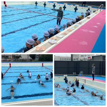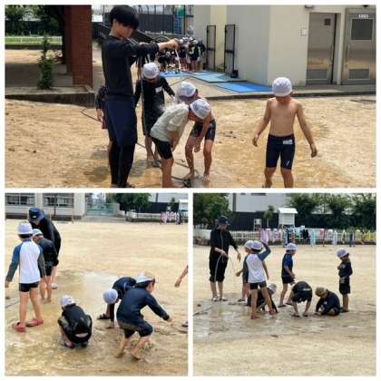 1年生は「どろんこ遊び」とプールを浅くして、トレイを使った「水遊び」を行いました。子どもたちは、泥の感触やトレイを船に見立てて浮かべる遊びなどを楽しんでいました。