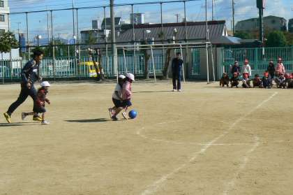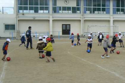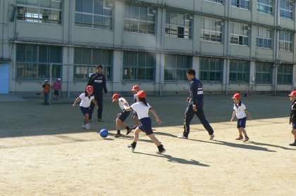 3時間目は、コーチ2人との試合です。コーチの巧みなボールさばきにみんな驚いていました。コーチから得点を決めることができたときには、大歓声をあげていました。1.2年生ともサッカーを楽しむことができました。これからもいろんな運動に親しんでもらいたいと思います。