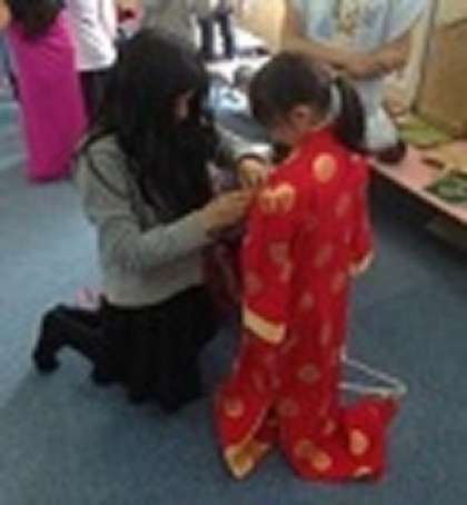 毎日たくさんの子どもたちがワールドルームに来て、衣装を着たり、展示品にふれたり、アルファベットやフォニックス(音と文字をつなげる学習)の学習ができるおもちゃで遊んだり、英語の絵本やDVDを見たりと、世界の様々な国の文化や言語に興味をもって活動しています。