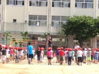 校門で大きな声であいさつをして、じゃんけんをして学校に入ってください。