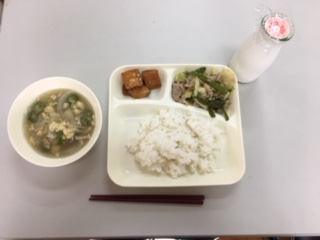 本日の献立は、豚肉と野菜のいためもの・かきたま汁・あつあげのみそだれかけ・ご飯・牛乳でした。