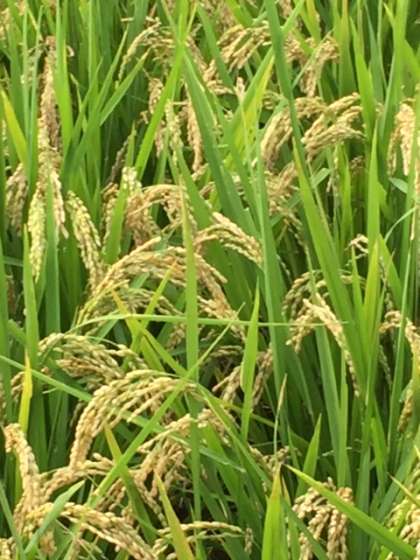写真をみるなり子どもたちは、「うわぁ 大っきいな」「もうすぐ収穫できるのかな」など言っていました。犬の散歩コースを田んぼコースにしたり、おうちの人の買い物についていくときに、一緒に見に行ったりと、子どもたちは、とても生長を楽しみにしています。なかなか直接見に行けない子どもは、写真をとても楽しみにしていて、今日は写真があるよ言うと、「やったー」と手を叩いて喜んでくれます。あんなに小さかった稲が、穂が垂れ下がり、色も少しずつ変化してきました。ますます生長が楽しみです。