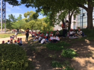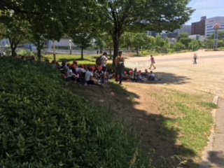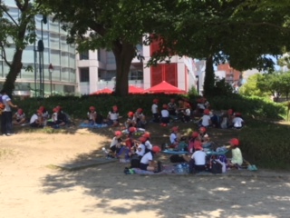 お弁当の時間です。とてもいいお天気です。みんなで仲良く食べています。