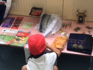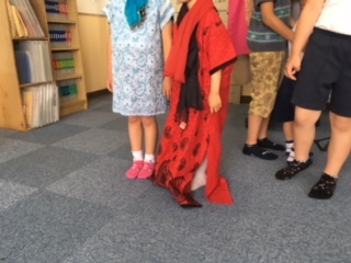 6年生に衣装を着せてもらったり、展示してあるものをいっしょに見学しました。