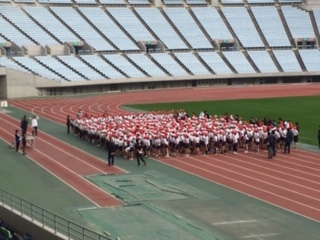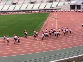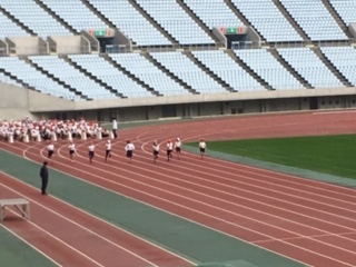 スポーツ交歓会を楽しんでいます。開会式と100m走です。