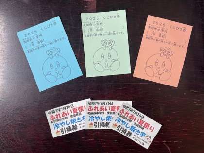 明日7月26日(土)、地域主催の「矢田西ふれあい盆踊り花火大会」が開催されます。会場は「公園南小公園」です。午後5時からの模擬店には、矢田西小学校PTAからおみくじの出店があります。また、冷やし焼き芋を引換券と交換していただける出店もあります。学校から配布しました「くじびき券・冷やし焼き芋引換券」を持ってきてください。花火の打ち上げは、午後8時に予定されています。なお、当日の会場周辺は、自転車の乗り入れが禁止されています。徒歩で来場してください。