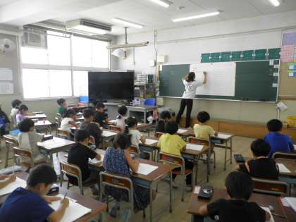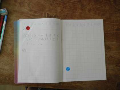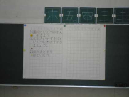 1年生の算数科の様子です。ブロックやさくらんぼ図をつかって、大きいかずが10といくつになるのかを考えました。先生の指示をよく聞き、丁寧に黒板の字を指示されたマスに写していくことができました。