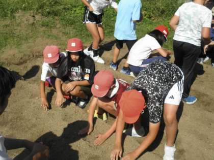 晴天のもと、地域の方から指導をいただき、4年生が学習園でなにわの伝統野菜である田辺大根の種植えをしました。植え方、育て方の説明を受けた後、一人ひとりに配られた4粒の種を丁寧に植えていきました。