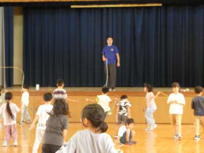 本日の参観終了後、講堂にてPTA総務委員会講演会(パフォーマンスショー)が開催されました。縄跳び世界ギネス記録をお持ちの、藤沢祥太郎さんにお越しいただきました。色々な跳び方を披露いただき、会場は大盛り上がりでした。子どもたちも新しい技にチャレンジしていました。