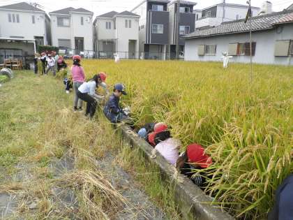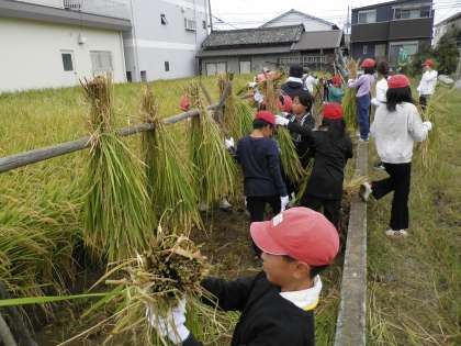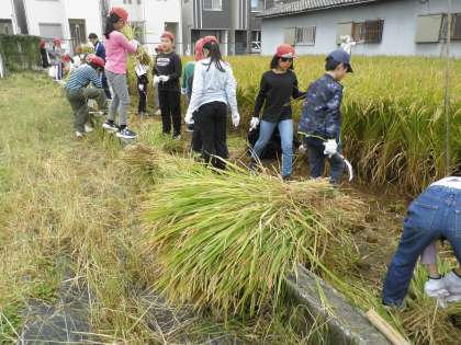 5年生は、地域の方とともに自分たちで田植えをした田んぼで、黄金色に輝き、腰の高さまである稲穂を刈り取っていきました。刈り取った稲穂を紐で束にして括り、天日干ししました。気持ちの良い汗をかきました。