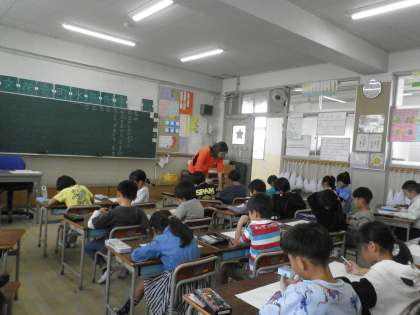 1年生の国語科の様子です。丁寧にかん字の練習を行っていました。筆圧もしっかりと、ゆっくり丁寧に書いている姿は真剣そのものでした。練習の後は、短文から誰が何をしたのかを読み取る学習をしました。