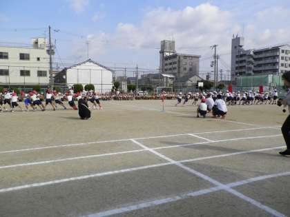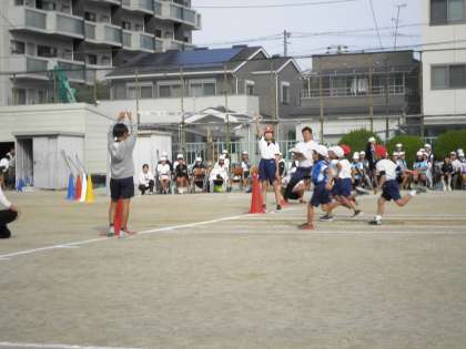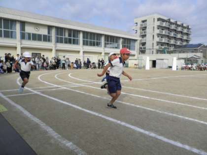 2年生は個人走「カーブをこえてゴールをめざせ!」、3年生は団体競技「みんなでひっぱれ!」、1年生は個人走「スタートラインのヒーローたち」。児童席からも大きな声援があがっていました。