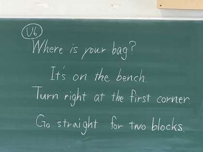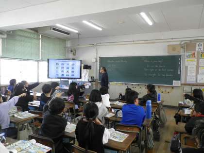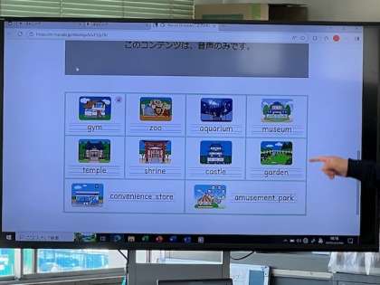 5年生の英語の様子です。「Where is 〜?」を使って、町中の様々な施設のある方向を確認していました。各施設の英単語をみんなで発音しながら、確認していました。