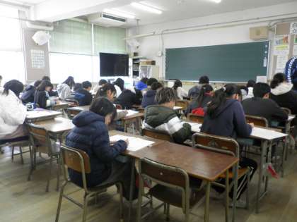 昨日から3〜6年生で実施している「学力経年調査」。今日は2日目で、算数・理科・英語(5・6年生のみ)の教科を行っています。どの学年も冊子になっている問題文に真剣に向き合っています。