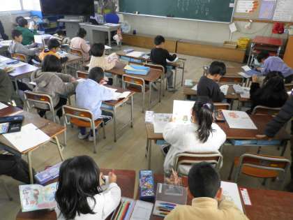 1年生では、お手本の文章をもとにして「自分の好きな本を紹介する作文」(イラストつき)を作成していました。
