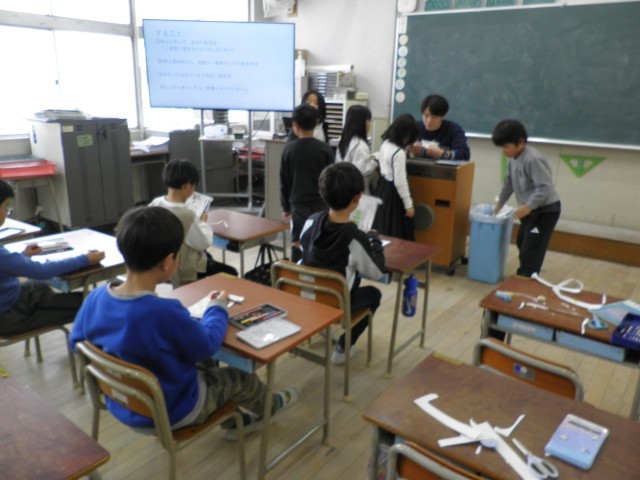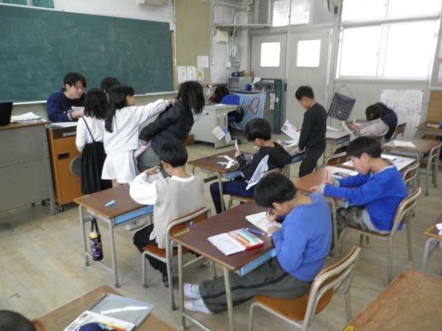 2年生では「今年の目標」作成の仕上げを行っていました。「字をきれいに書く」「国語と算数をがんばる」「苦手なことを克服する」など、それぞれに目標を立て、丁寧に書いていました。色鉛筆での着色や型通りに切り抜く作業も気持ちを込めて作業することができました。