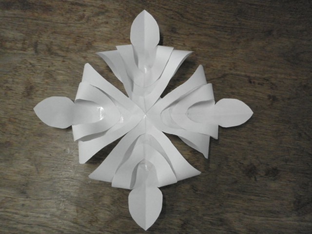 4年生の図工の様子です。正方形の紙を三角形に織り込んで、切込みを入れて広げると、不思議な形が完成しました。中央に両面テープを貼り、外側から順に貼り合わせていくと…きれいなお花が完成しました。みんな、集中して取り組んでいたので、作業中は静まり返っていました。