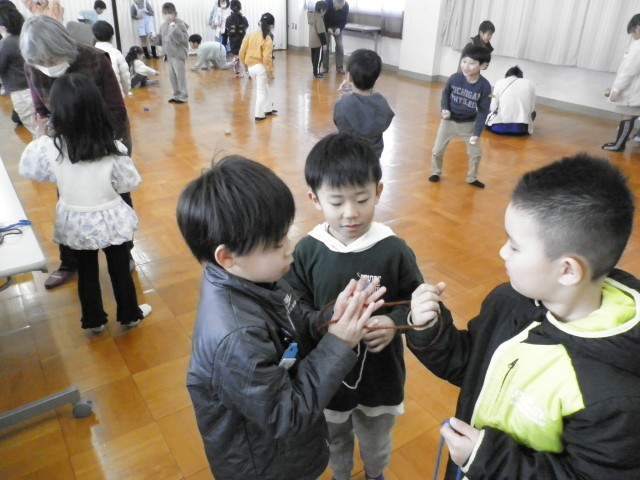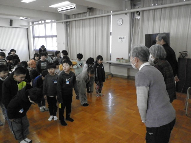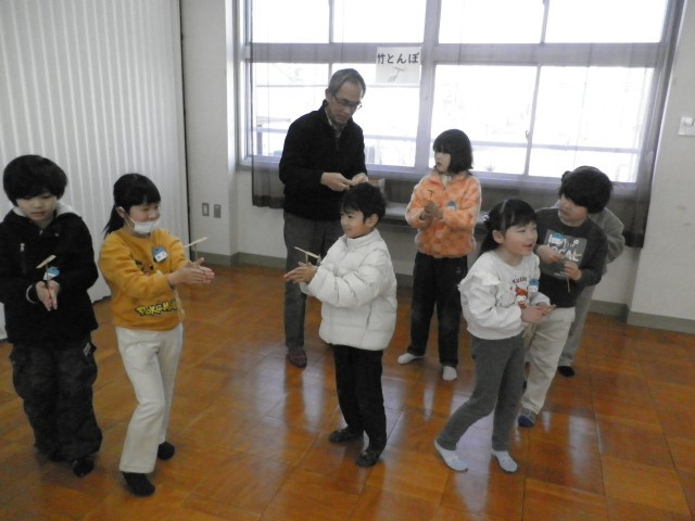 地域の見守り隊の方にお越しいただき、1年生と一緒に「むかし遊び」を楽しみました。4つのグループに分かれ、「けん玉」「お手玉」「竹とんぼ」「あやとり」でそれぞれ遊びました。最近はなかなか見慣れない遊びですが、1年生は上手に遊べており、見守り隊の方も驚かされていました。とても楽しく、幸せな時間を過ごすことができました。