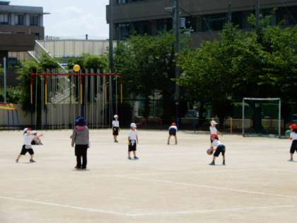 ドッジボールを両手でどれぐらいの高さまで投げ上げられるかや、二人組になって投げたり、受けたりしてあそびました。