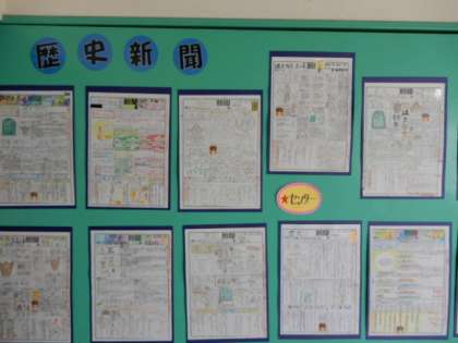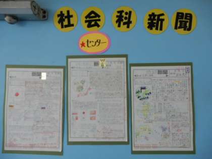 紙面を工夫したり、詳しく調べてまとめたりしている新聞は、「センター」に掲示されます。みんなセンターに掲示してほしくて、しっかりがんばって新聞づくりをしています。