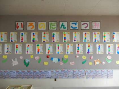 1年生の教室では、「いろのだんごつみ」の作品を掲示しています。