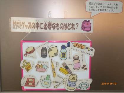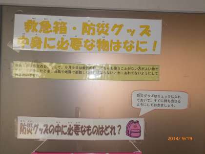 防災に関する掲示です。子ども達が防災についての関心を高めてほしいと思います。