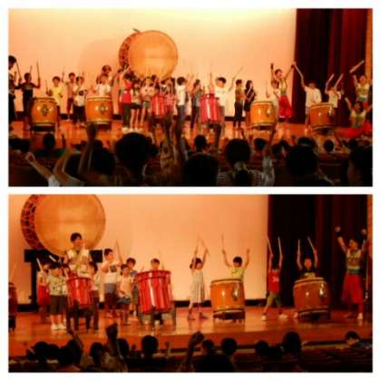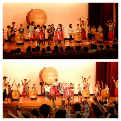 演奏と演奏の間に、各学年が舞台に上がって和太鼓を実際に叩いてリズムを取りました。