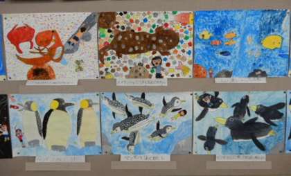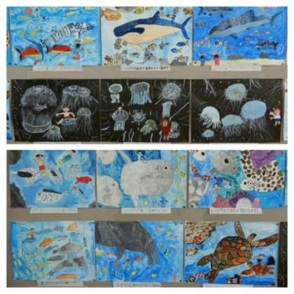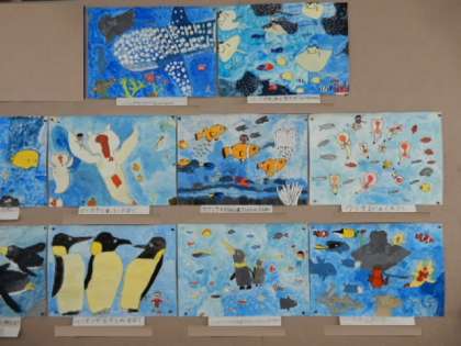 4年の教室の背面掲示板には、春の遠足で行った海遊館の思い出の絵が貼られています。ジンベイザメやウミガメ、くらげなど、それぞれ印象に残っている場面が表現されています。