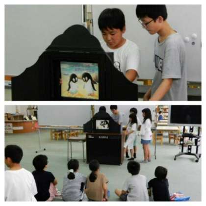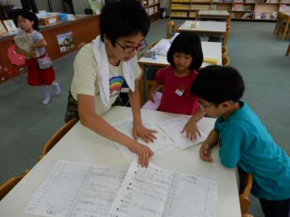 図書館に来てくれた人に、紙しばいをしたり、スタンプカードをチェックしたり、大忙しでした。