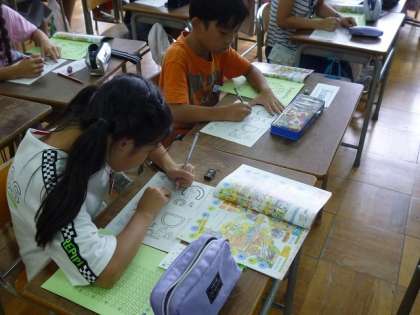 7月5日(金)4年生は、C−NETの先生に来ていただいて外国語活動の学習をしました。春夏秋冬を英語で言ったり、アルファベットの「c」と「d」を書く練習をしました。