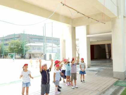 運動場と中庭の間に熱中症の予防のため、ミストを取り付けました。