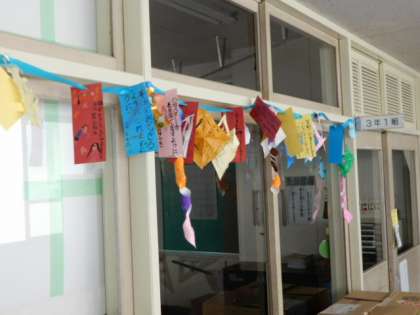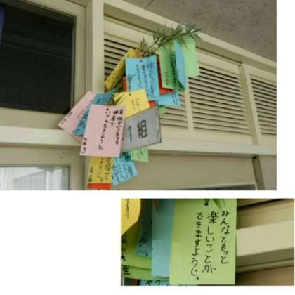 校舎を回っていると、教室の入り口に七夕の笹飾りを見つけました。