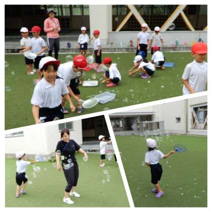 7月17日(水)1年は、生活科の学習でシャボン玉を作って遊びました。