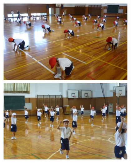1・2年生は、曲に合わせて楽しく体を動かしていました。