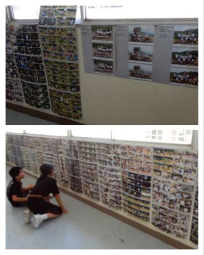 5年の教室前廊下の窓の所に、林間学習の時の集合写真とスナップ写真を貼り出しています。休み時間には、子どもたちが林間学習の時のことを思い出しながら見ています。