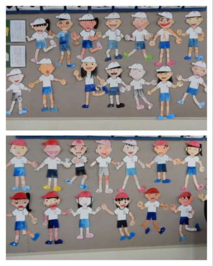 3年の教室の背面掲示板には、運動会前なので赤組・白組に分かれた自画像が貼られていました。みんな楽しそうな顔でした。