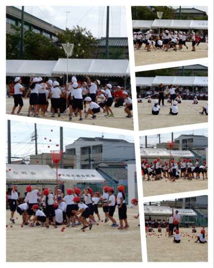 1・2年生の玉入れです。音楽が途中でストップすると、投げるのもストップします。その静と動が見ていて楽しかったです。