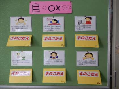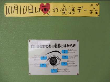10月10日は、「目の愛護デー」にちなんで、保健室前の掲示板には「目と目のまわりの名称とはたらき」と「目の○×クイズ」を掲示しています。○×クイズは、全部で6問。全部正解できるかな。