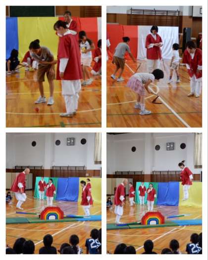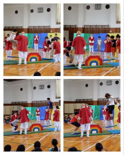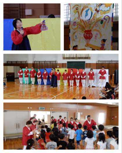 後半は、韓国・朝鮮の遊びで、ペンイ(こま回し)とノルティギを児童代表がしました。ノルティギは、先生代表も出て高く跳び上がりました。
