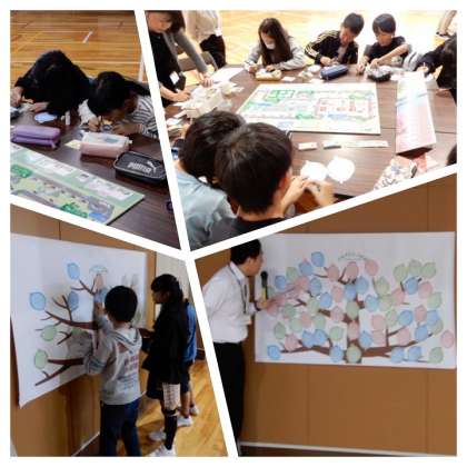 授業の終わりには、今日の学習で学んだことについての感想を葉っぱに見立てたメモ用紙に書いて「クルマと環境」の木に貼り付けていきました。
