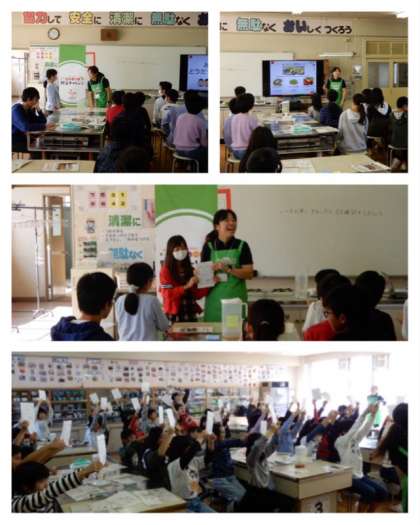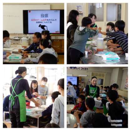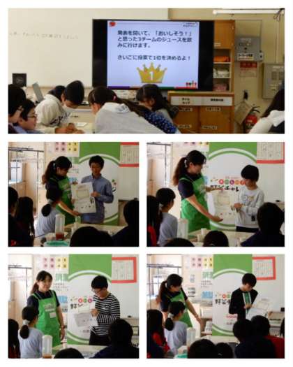 後半は、「おいしい野菜チャレンジ〜最強のジュースレシピをつくってみよう〜」と題して、いろいろな果物や野菜のジュースを混ぜ合わせてオリジナルのジュースをつくり、人気投票で1位グループを決めました。授業の最後には、全員に認定証をいただきました。
