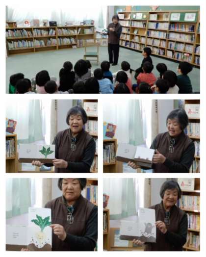 仕掛け絵本では、畑の葉っぱを見て土の中にある野菜をクイズのように当てていきました。最後は、野菜ではなく、モグラさんでした。
