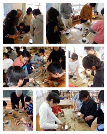 金槌で模様を付け、木槌でくぼみをつけて小皿を作りました。みんな世界で一つだけのオリジナルのお皿ができました。