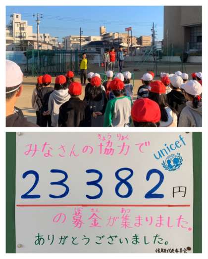 12月16日(月)の全校朝会で、児童会の代表委員が先週行ったユニセフ募金の結果の報告とお礼を言いました。