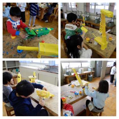 いろいろな形の箱などを使って、キリンやワニなどの動物を作っています。中には首が伸びるキリンなど、とても工夫されたものもありました。