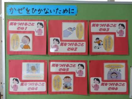 保健室前の掲示板では、風邪ひかないための6つの気をつけることをクイズ形式にして掲示しています。しっかり守って風邪に負けない体づくりをしてほしいです。
