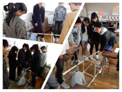 6年生は、てこの学習をしていました。てこを使うと重い荷物も簡単に持ち上げられることを体感しました。