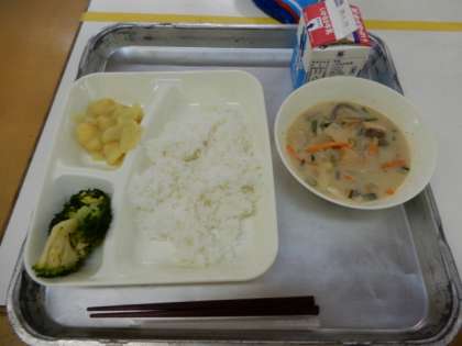 1月17日(金)の給食献立は、かす汁、ブロッコリーの生姜漬け、栗きんとん、ご飯、牛乳です。