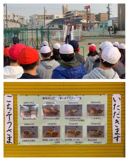 今日の全校朝会では、担当から「いただきます」「ごちそうさま」についての意味を話しました。また、食堂入り口に「給食の歴史」をパネルにして貼り出し、給食について関心を高めています。