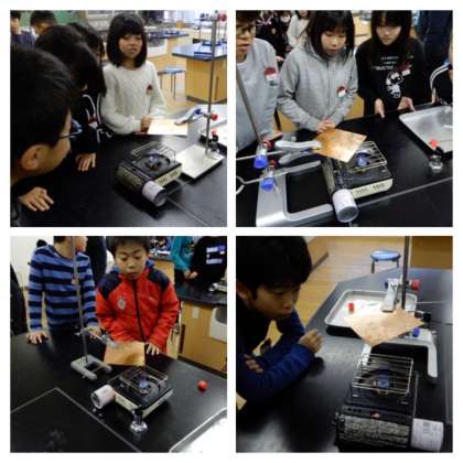 金属はどのような温まり方をしていくにかを実験で確かめていました。金属の表面に塗ったロウが扇状に広がっていく様子に見入っていました。